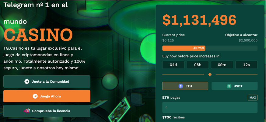 La preventa de tokens de TG.Casino ($TGC) está siendo todo un éxito y ya ha superado la marca de capitalización flexible de 1 millón de dólares, encontrándose a más de un 40% del siguiente objetivo a alcanzar de 2,5 millones de dólares.