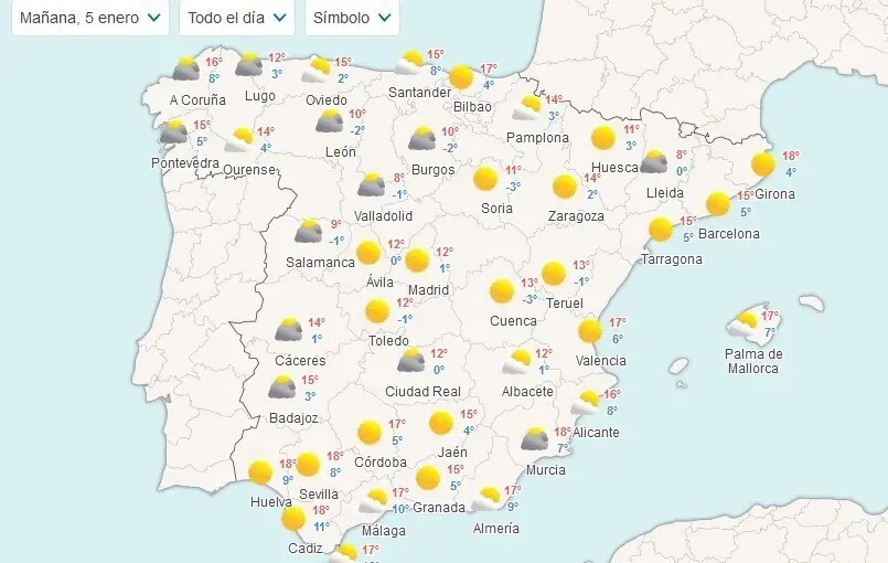 El viernes, 6 de enero, día de Reyes, se mantendrá el sol en buena parte del país, pero empezará a cambiar el tiempo en Galicia, donde un frente nublará los cielos y generará chubascos al final de la jornada en la parte occidental.