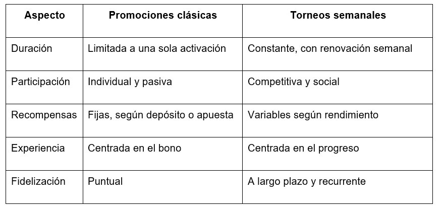 Antes de revisar la tabla comparativa, es importante entender que los torneos semanales no buscan sustituir a las promociones clásicas, sino complementarlas. Aportan dinamismo, interacción y un sentido de continuidad que los bonos de un solo uso no pueden ofrecer.