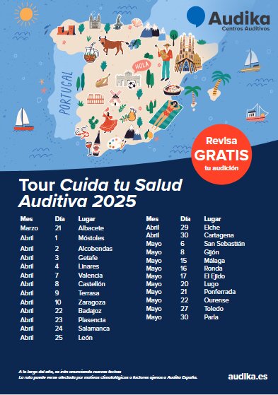 En el marco del mes de la salud auditiva, Audika, compañía experta en salud auditiva que forma parte del grupo Demant, lanza la cuarta edición de su tour "Cuida tu salud auditiva", un evento itinerante que recorrerá 32 localidades españolas a lo largo de 2025.