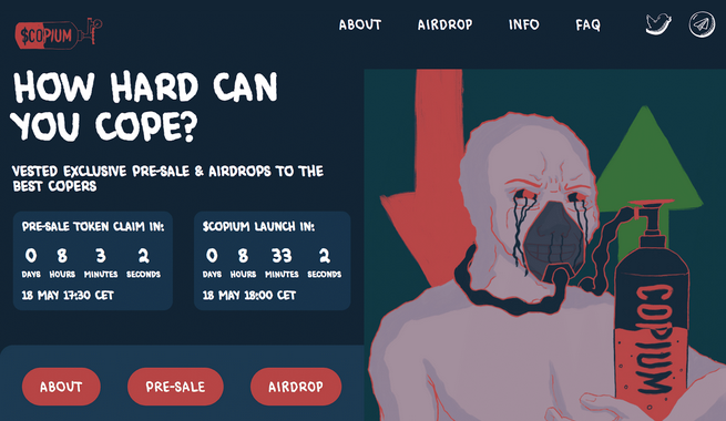 Copium es un proyecto que empatiza con los errores en los que muchos inversores de criptomonedas han caído en sus inicios: comprar en el momento más alto, caer en una estafa del esquema Ponzi, seguir los consejos de influencers o perder el valor de la inversión. Con una página web original y divertida, posicionan su token $COPIUM como un movimiento para lidiar con tus errores pasados y convertirlos en beneficios.