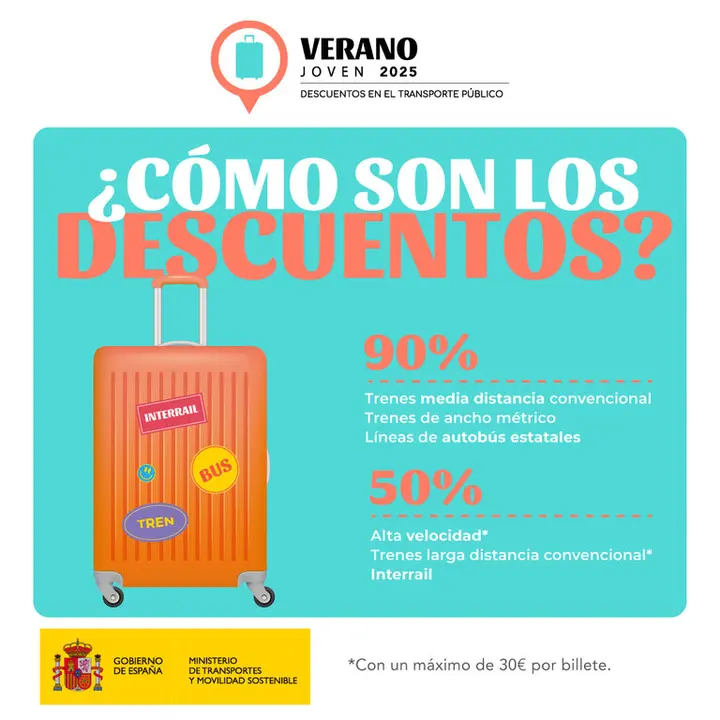 En esta edición de Verano Joven se podrán beneficiar de los descuentos todos los jóvenes nacidos entre el 1 de enero de 1995 y el 31 de diciembre de 2007, que podrán conseguir billetes de autobús y tren con descuento desde el 1 de julio al 30 de septiembre de 2025. Los descuentos contemplados en el programa Verano Joven son los siguientes: