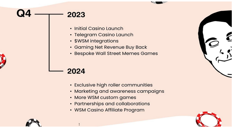 Wall Street Memes piensa en el futuro, con una hoja de ruta integral hasta finales de 2024. Entre los planes de ruta se incluyen la creación de comunidades exclusivas de grandes apostadores que ofrecen acceso a apuestas y juegos organizados, juegos exclusivos y personalizados de $WSM, colaboraciones basadas en un nuevo programa de afiliados en WSM Casino y gran cantidad de campañas de marketing.