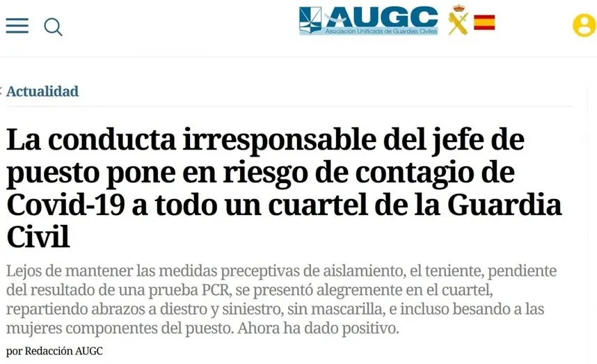 A pesar de ello, en su web y redes sociales, la AUGC mantiene su información, califica de irresponsable la actitud del teniente y asegura sentirse perpleja ante tal comportamiento. “No podemos sino mostrar nuestra perplejidad ante el inconsciente comportamiento de este mando, que ha puesto en riesgo a todos los componentes del puesto del que es responsable, y por ende la seguridad pública de toda la localidad, que además ya fue fuertemente golpeada por el Coronavirus en la oleada de la pasada primavera”, indican.