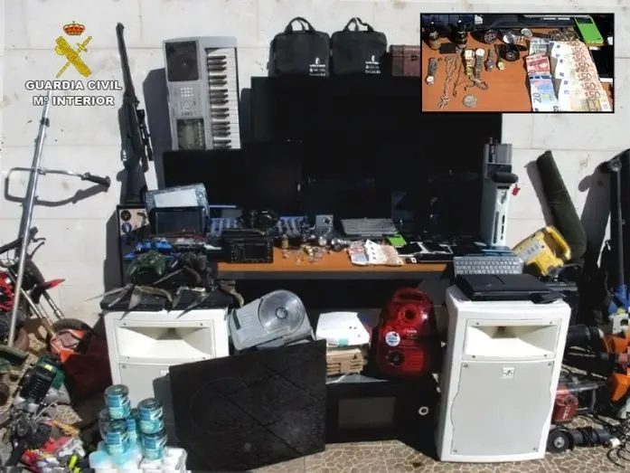 Tras la incautación de varias dosis de estupefacientes, recién adquiridas, cuyos poseedores fueron denunciados por este hecho, la Guardia Civil llevó a cabo un registro en este domicilio, en el que fueron intervenidos un vehículo, 418 euros en efectivo, joyas, relojes, ordenadores, gran cantidad de teléfonos móviles, video consolas, televisores, electrodomésticos, enseres de casas de campo, radios cd, tablets, altavoces, pistoletes, radiales, antigüedades y numerosas herramientas tanto manuales como eléctricas, cuya procedencia no pudieron acreditar los moradores de la vivienda.