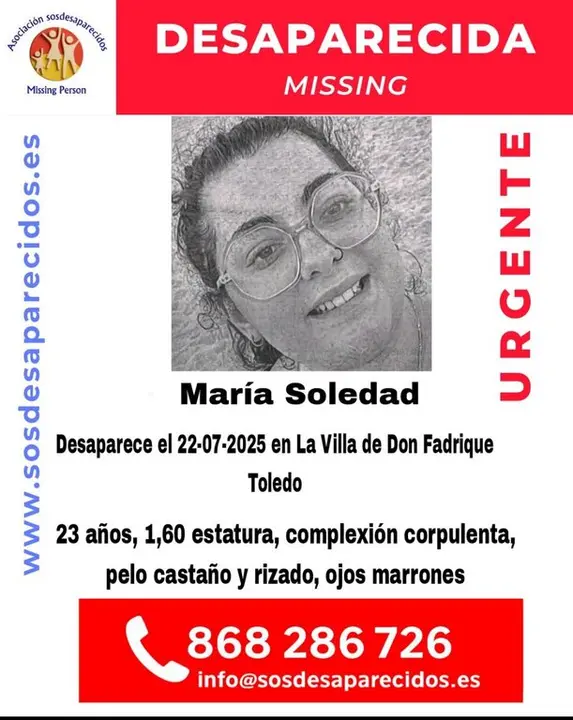 El Centro Nacional de Desaparecidos (CNDES) y la Asociación SOS Desaparecidos han lanzado alerta urgente para localizar a María Soledad, una joven de 23 años que desapareció el pasado martes, 22 de julio, en el municipio toledano de La Villa de Don Fadrique.