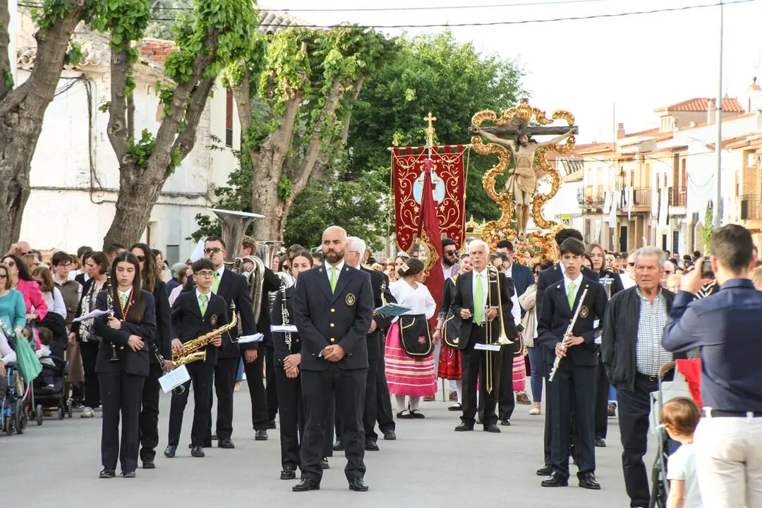 Cien años después, y con el mismo recorrido de aquel 17 de mayo de 1925 cuando todo el pueblo de La Villa de don Fadrique sacó en rogativas al Santísimo Cristo del Consuelo hasta el pozo de los Caramelos, situado en la salida del camino a Quero, para que este mandara el agua desde el cielo que paliara los sedientos campos de aquel año de fatídica sequía. Y todo el pueblo fadriqueño salió este sábado, 17 de mayo, pero de 2025, con el mismo fervor y embargados por la emoción del momento histórico, para conmemorar aquel milagro en una multitudinaria procesión que puso fin al Año Jubilar que por tal motivo ha celebrado este municipio toledano. No faltó nadie, los sacerdotes hijos del pueblo, autoridades con el alcalde Jaime Santos Simón a la cabeza, la Mayordomía con su presidente Maximino Sánchez, todos los estandartes de las hermandades y cofradías de la Parroquia de Nuestra Señora de la Asunción del municipio fadriqueño, pero también otros muchos venidos de poblaciones como Lillo, Corral de Almaguer, Villamayor de Santiago, Villanueva de Alcardete, Quintanar de la Orden, La Puebla de Almoradiel y Quero, entre otros. Todos ellos abrieron la comitiva a eso de las siete de la tarde para iniciar aquel histórico recorrido en un día histórico para La Villa de don Fadrique como hace un siglo. Tampoco faltaron la reina de la Juventud, Laura Aparicio Romero, la reina de la Simpatía, Eliana Marín Martínez, y la reina de las Fiestas, Cristina Díaz-Maroto Antonesei, entre otros. El recorrido estuvo elegantemente adornado por los vecinos con altares en honor al patrón fadriqueño.