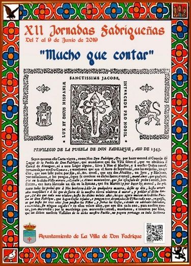 El cartel anunciador de las XII Jornadas Fadriqueñas se ha realizado tomando como base la Carta Puebla que otorgó el 25 de abril de 1343 el Infante don Fadrique de Castilla, hermanastro de Pedro I El Cruel, en base a los privilegios que se le concedieron según el Fuero de Sepúlveda. El homenaje que esta población toledana le hace a su fundador, recuerda la fecha de la muerte un 29 de mayo de 1358 en los reales alcázares de Sevilla, del que fuera entonces Maestre de la Orden de Santiago, con sede en Uclés (Cuenca) y que fue el hermano gemelo del primer rey de la dinastía de los Trastamara en el Reino de Castilla, Enrique II, quien sucedió al hermanastro de ambos en 1369 tras la Batalla de Montiel, de cuyo suceso se conmemora este año los 650 años.
