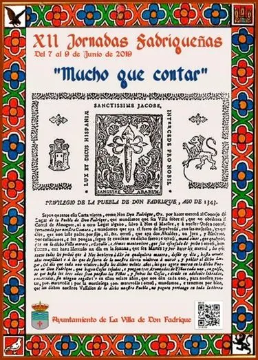 El cartel anunciador de las XII Jornadas Fadriqueñas se ha realizado tomando como base la Carta Puebla que otorgó el 25 de abril de 1343 el Infante don Fadrique de Castilla, hermanastro de Pedro I El Cruel, en base a los privilegios que se le concedieron según el Fuero de Sepúlveda. El homenaje que esta población toledana le hace a su fundador, recuerda la fecha de la muerte un 29 de mayo de 1358 en los reales alcázares de Sevilla, del que fuera entonces Maestre de la Orden de Santiago, con sede en Uclés (Cuenca) y que fue el hermano gemelo del primer rey de la dinastía de los Trastamara en el Reino de Castilla, Enrique II, quien sucedió al hermanastro de ambos en 1369 tras la Batalla de Montiel, de cuyo suceso se conmemora este año los 650 años.