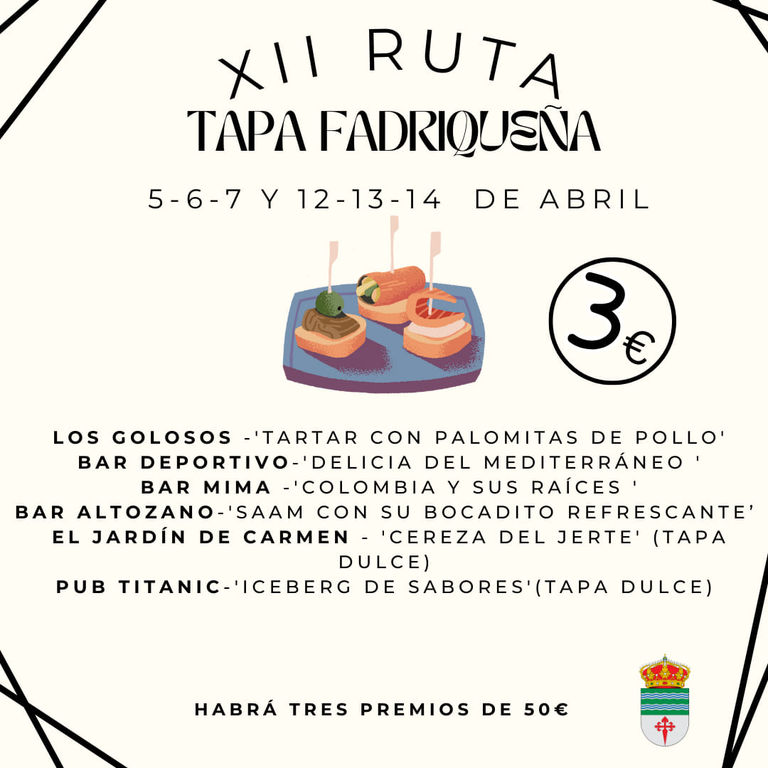 Este año son seis los bares y restaurantes del municipio manchego que concursarán y ofrecerán sus exquisitas y divertidas creaciones culinarias ante el gran público y que podrán ser consumidas por fadriqueños y personas venidas de distintos puntos de la comarca. El precio de la tapa será de tres euros, y como en las ediciones anteriores, la consumición dará derecho a votar, según condiciones de la cartilla de votación. Con ese voto, se participará en un sorteo de tres premios de 50 euros de consumición que se realizarán entre los clientes de los dos locales participantes.