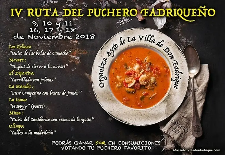 Con el frío, llega también el momento de degustar ricos platos de cuchara, y por ello los próximos 9, 10 y 11, 16, 17 y 18 de noviembre, tendrá lugar en La Villa de don Fadrique, la IV Ruta del Puchero Fadriqueño.
