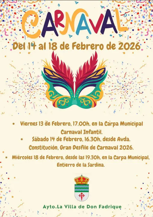 El Ayuntamiento de La Villa de Don Fadrique, a través de su Concejalía de Cultura y Festejos, ya tiene preparada la Programación del Carnaval 2026, que se celebrará entre el 13 y el 18 de febrero próximos con actividades pensadas para todos los públicos, empezando con actividades infantiles, talleres creativos, y el acto central, que será el desfile de comparsas y carrozas del sábado, 14 de febrero, junto a otras actividades festivas de color, creatividad y diversión, para terminar con el solemne y festivo cierre del entierro de la sardina el miércoles de ceniza.