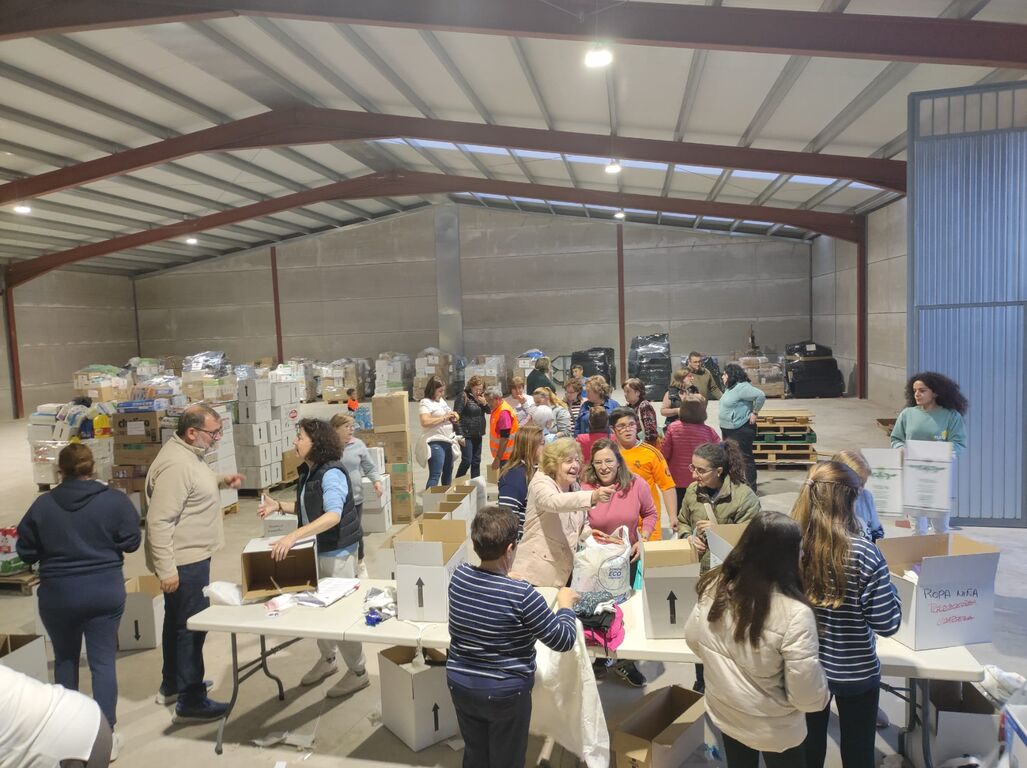 Sobre un centenar de voluntarios han estado trabajando incansablemente entre los dos días para dejarlo todo a punto, recepcionar, empaquetar y clasificar todos los productos recibidos, embalarlos convenientemente en palets que componen ropa de todo tipo y para todas las edades, productos de higiene personal y doméstica para la limpieza, ropa de trabajo, productos para limpiar las calles, alimentos sin gluten y sin lactosa, pañales, cunas, carros de bebé, sillas de coche para bebés, calzado de trabajo, botas de agua, una de las cosas que más se están necesitando, algunos electrodomésticos como pequeños hornos y cocinas de camping gas, muchos alimentos más, mascarillas, guantes, algunas medicinas y todo tipo de enseres para ayudar a los afectados por este fenómeno meteorológico y para ayudar a los miles de voluntarios que, sobre el terreno, llevan trabajando todos estos días para recuperar la normalidad cuanto antes en todos los municipios que se han visto sorprendidos por la riada, tanto de la provincia de Valencia como los de Castilla-La Mancha, que lindan con la Comunidad Valenciana.