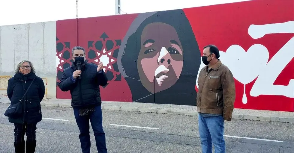 Un acto en el que se inauguró el nuevo mural que Ricardo Díaz y Fran García han elaborado en el llamado Muro de la Paz del paseo de la Estación. Una “Gioconda manchega” como la calificaron, que es capaz de seguir con la mirada a quienes paseen en cualquier dirección. La figura preside el mural, que se completa con la palabra paz, en la que un corazón que llora o sangra sustituye a la “a”, y con elementos decorativos basados en la geometría de una estrella de 8 puntas.