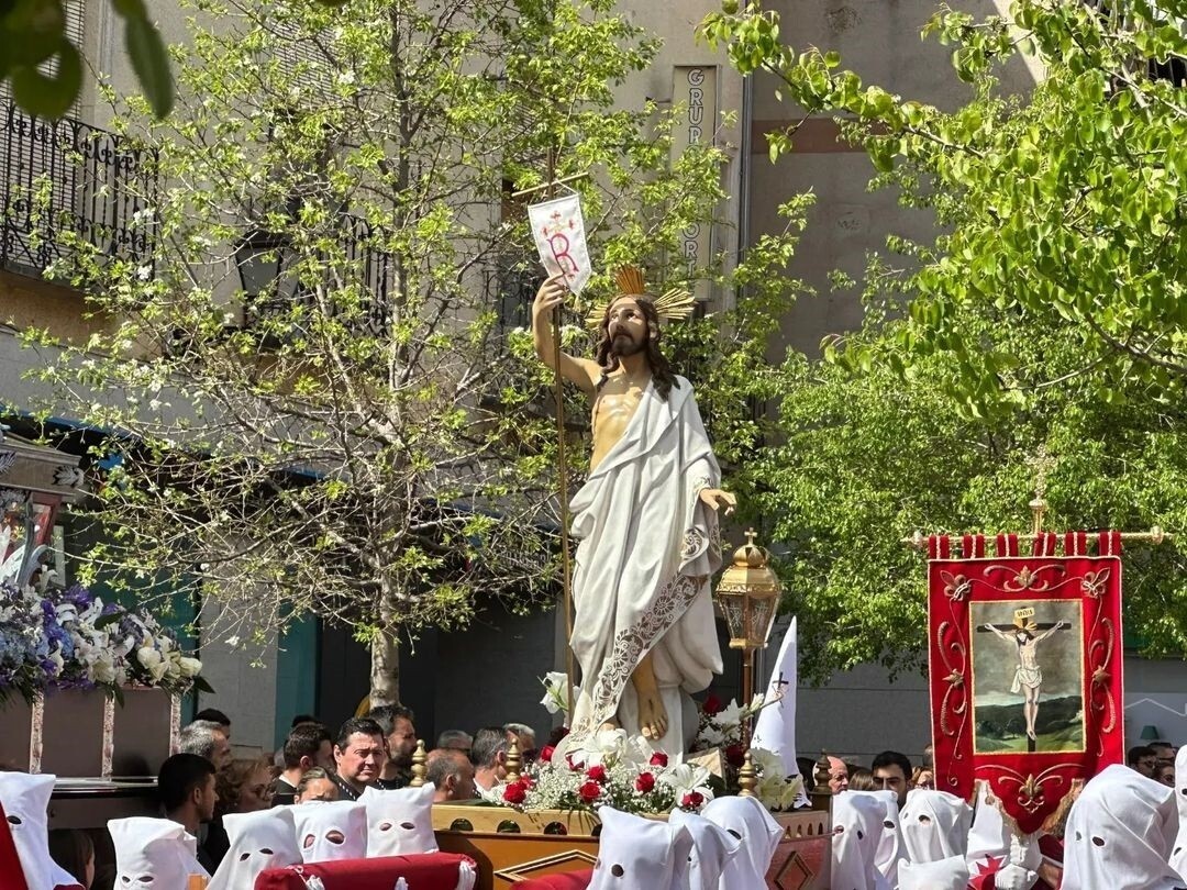Desde las 11 de la mañana de ayer desfilaron las imágenes de Jesús Resucitado, el Santo Sepulcro vacío, María Magdalena, San Juan Evangelista y Ntra. Sra. del Rosario. Cada una realizó un recorrido distinto, aunque los momentos más relevantes se vivieron en la plaza de España con los encuentros de San Juan y María Magdalena con la urna vacía, con la Virgen, y finalmente con el Resucitado, momento de alegría que se ha plasmado en la gran tamborrada final que ha llevado a las imágenes y a los fieles desde la plaza hasta la iglesia parroquial. El párroco de Villacañas, Luis Lucendo, se ha encargado de narrar y explicar cada momento vivido, acompañado por sacerdotes de la parroquia, autoridades encabezadas por el alcalde, Jaime Martínez, y por supuesto, los miembros de las cofradías que ayer salieron a la calle.