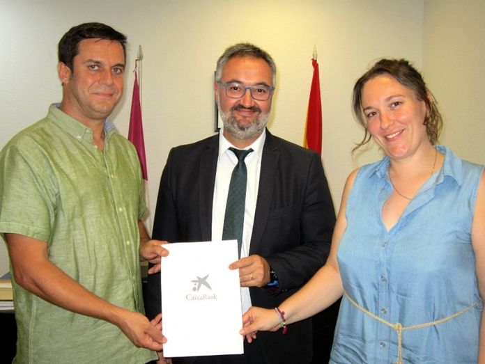 Imagen: De izquierda a derecha, el alcalde, el director de la oficina de Caixabank en Villacañas, y la concejala de Servicios Sociales, Ana Avilés