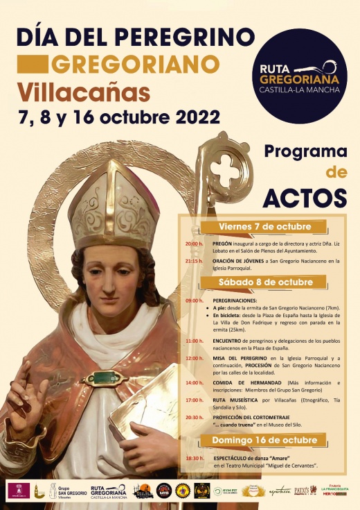 Los actos programados, organizados por el Grupo San Gregorio Nacianceno, la Parroquia de Ntra. Sra. De la Asunción y el Ayuntamiento de Villacañas, comenzarán este viernes 7 de octubre a las 20 h. con el Pregón inaugural por parte de la directora y actriz de la localidad, Liz Lobato, en el salón de plenos del Ayuntamiento. Posteriormente a las 21:15 h. tendrá lugar una Oración de jóvenes a San Gregorio Nacianceno en la Iglesia parroquial como acto de preparación espiritual para la jornada del sábado.