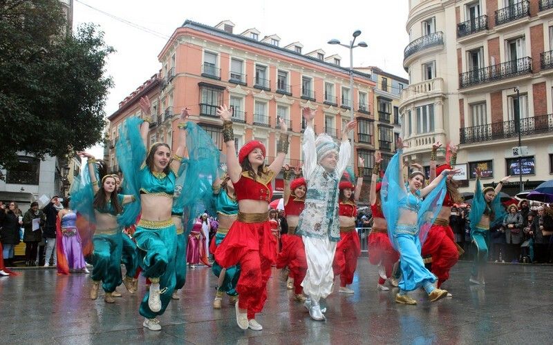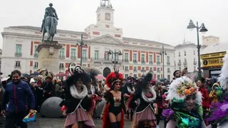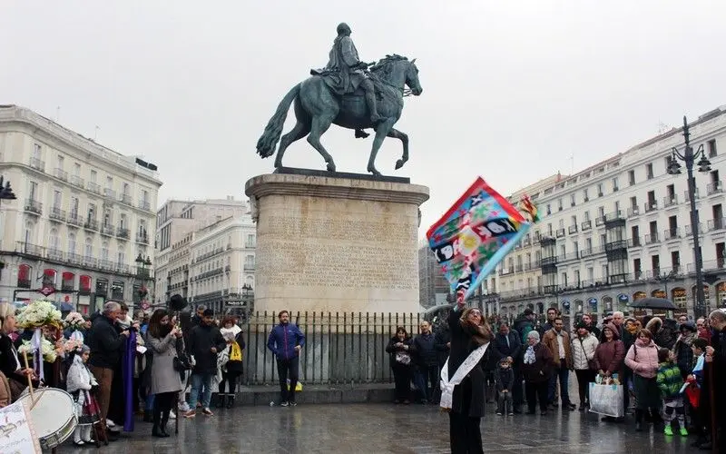 Coreografías, batukada y “baile de la bandera” se sucedieron en estos puntos, dando paso después al desfile por las calles Preciados y el Carmen, pasando por Sol, donde bajo la atenta mirada de Carlos III los abanderados también pudieron demostrar sus habilidades.
