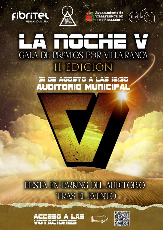 “La noche V” es un proyecto que nace con la intención de dar visibilidad a todo lo que hace grande a Villafranca de los Caballeros, desde sus bares y peluquerías hasta los músicos y grupos de amigos. Una gala de premios peculiar, en la que lo más importante no es quien gane en cada una de las categorías, sino que busca la unión entre personas de distintas ideologías, religiones... a través de un mismo mensaje “ser de Villafranca y valorar todo lo bueno que tenemos y que quizás no nos paramos a pensar”.