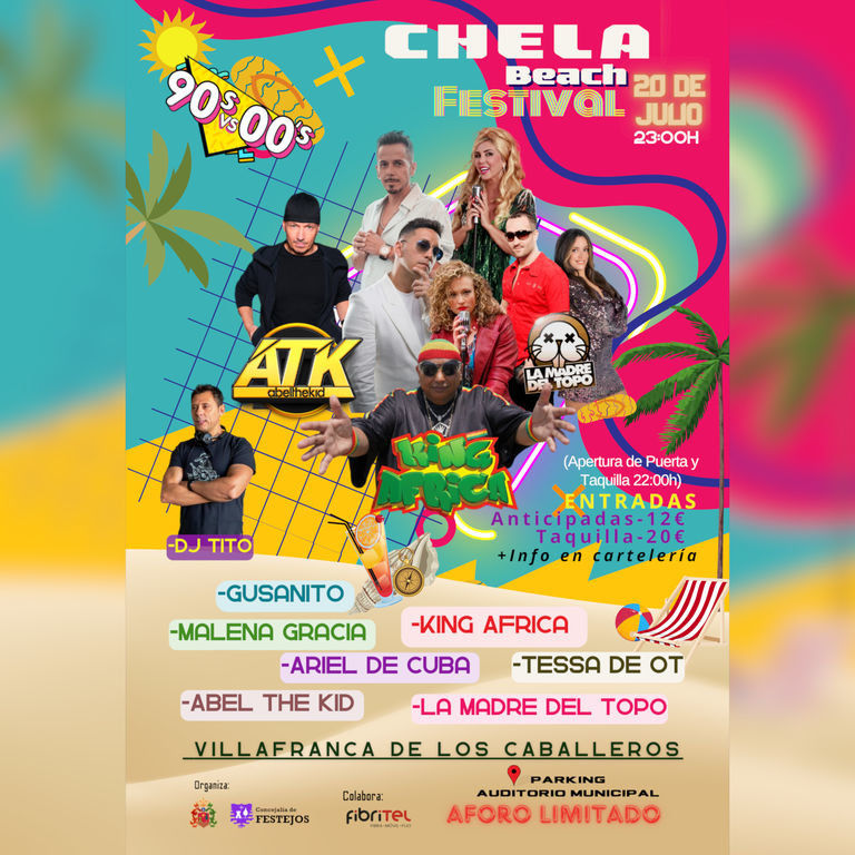El Chela Beach Festival será un momento único en la zona para disfrutar de la música de los años 90 y 2000. El Festival contará con las actuaciones de King África, Malena Gracia, Gusanito, La Madre del topo, Ariel de Cuba, Tessa de OT y Abel the Kid. Además, durante toda la velada se contará con el dj local “Dj Tito”.