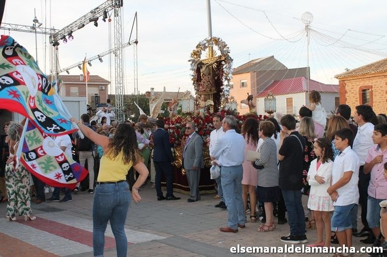 La procesión ha dado comienzo a las 19:30 horas desde la iglesia parroquial, en la que la imagen del Santísimo Cristo de Santa Ana ha estado precedida por los representantes de todas las hermandades del municipio toledano, así como de los niños que este año han tomado la Primera Comunión, algo nuevo este año, y además, a la salida de la imagen se ha procedido al volteo de banderas medievales, algo que se ha repetido durante todo el recorrido, desde la Iglesia a la ermita.