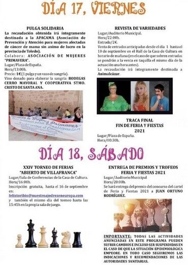 La localidad toledana de Villafranca de los Caballeros está a punto de iniciar sus Fiestas patronales en honor al Santísimo Cristo de Santa Ana, unas fiestas que no pudieron celebrarse el pasado año por la pandemia y que en esta ocasión han contado con algunos cambios y el deseo de poder celebrarlas con la máxima normalidad posible y, sobre todo, en las que hay que tener mucho cuidado, tal como ha señalado a elsemanaldelamancha.com la concejala de Festejos, Juventud y Nuevas Tecnologías, Estefanía Fernández Alejo. La Feria y Fiestas se celebrarán del 13 al 17 de septiembre.