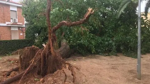 El fuerte viento arranca una morera en el barrio de Santa María de Alcázar