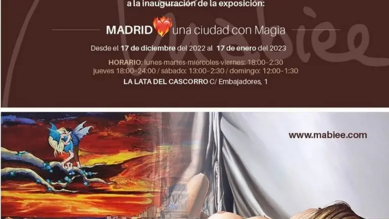 DEL 17 DICIEMBRE 2022 AL 17 ENERO 2023 Inauguración de la exposición “Madrid, una ciudad con magia”, de la pintora internacional Mabiee El Semanal 10/dic/22 15:00 Inauguración de la exposición “Madrid, una ciudad con magia”, de la pintora internacional Mabiee