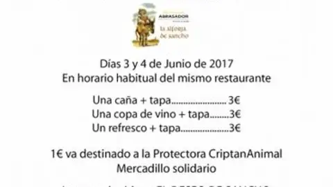 LOS DÍAS 3 Y 4 DE JUNIO, CON LA COLABORACIÓN DE LA ALFORJA DE SANCHO CriptAnimal organiza el II Tapeo Solidario El Semanal 30/may/17 15:12 CriptAnimal organiza el II Tapeo Solidario