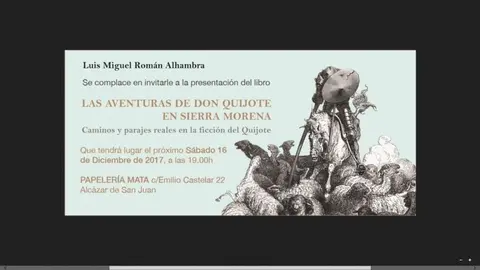 EL SÁBADO, 16 DE DICIEMBRE, EN LA PAPELERÍA MATA DE ALCÁZAR DE SAN JUAN Román Alhambra presenta su nuevo libro "Las aventuras de don Quijote en Sierra Morena" R. Tejera 09/dic/17 14:26 Román Alhambra presenta su nuevo libro "Las aventuras de don Quijote en Sierra Morena"