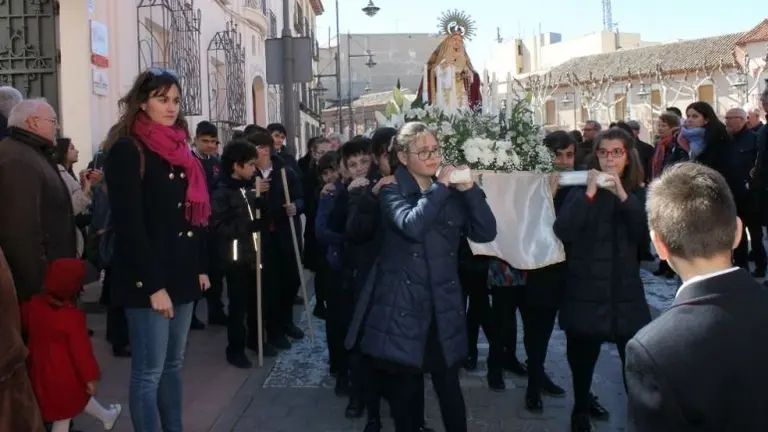 Multitudinaria procesión de los alumnos del colegio de la Sagrada Familia por las calles de Alcázar
