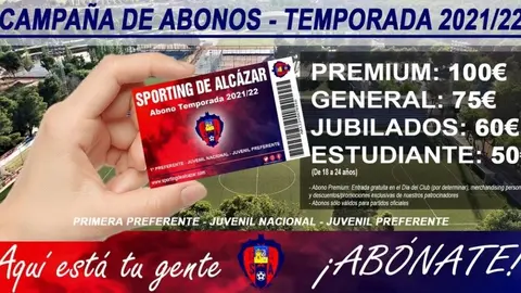 Con el lema “Aquí está tu gente” Abónate En marcha la campaña de abonos del Sporting de Alcázar para la temporada 2021/22 F.J. Parras 13/ago/21 20:53 En marcha la campaña de abonos del Sporting de Alcázar para la temporada 2021/22