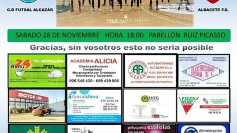 A partir de las 18 horas en el pabellón Picasso (Parque) El juvenil del CD Futsal Alcázar recibe al Albacete FS “B” F.J. Parras 25/nov/20 11:34 El juvenil del CD Futsal Alcázar recibe al Albacete FS “B”