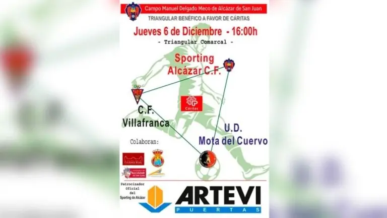 Será el jueves 6 de diciembre con motivo de la fiesta de la Constitución El Sporting de Alcázar organiza un triangular solidario a beneficio de Cáritas @JesusVillajos 27/nov/18 20:30 El Sporting de Alcázar organiza un triangular solidario a beneficio de Cáritas