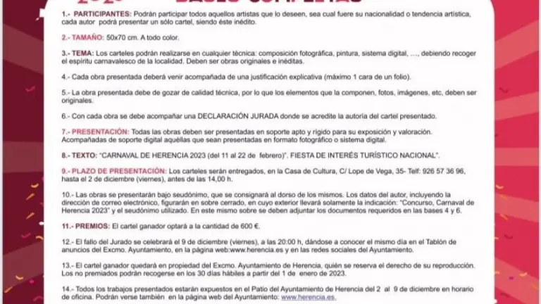 Herencia Herencia pone en marcha la maquinaria del Carnaval 2023 con el concurso del cartel anunciador El Semanal 28/oct/22 15:24 Herencia pone en marcha la maquinaria del Carnaval 2023 con el concurso del cartel anunciador