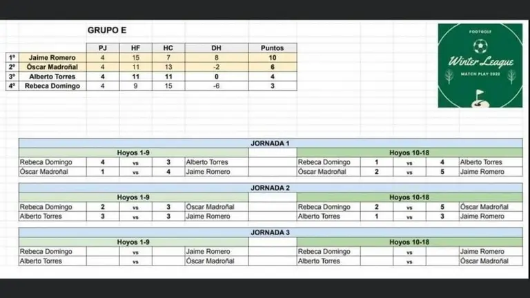 Tras la disputa de las dos primeras jornadas de competición El alcazareño Jaime Romero lidera el grupo E de la Winter League Footgolf F.J Parras 27/ene/22 12:05 El alcazareño Jaime Romero lidera el grupo E de la Winter League Footgolf