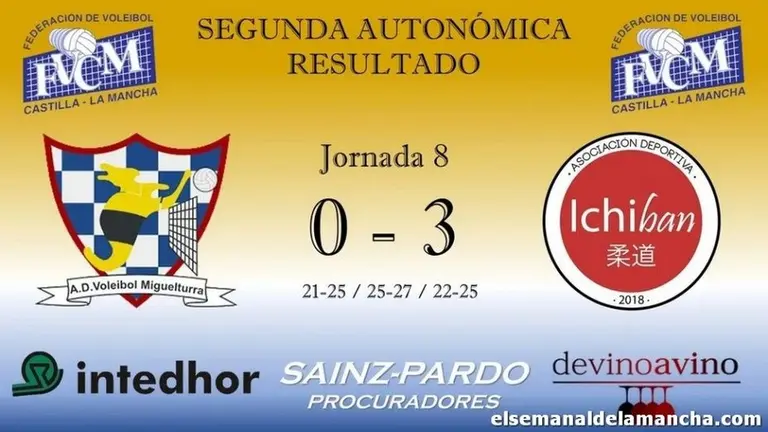 Se impuso por un claro 0-3 al ADV Miguelturra JR Nueva victoria a domicilio del CV Ichiban que le permite afianzarse en la tercera posición F.J. Parras 15/feb/22 19:32 Nueva victoria a domicilio del CV Ichiban que le permite afianzarse en la tercera posición