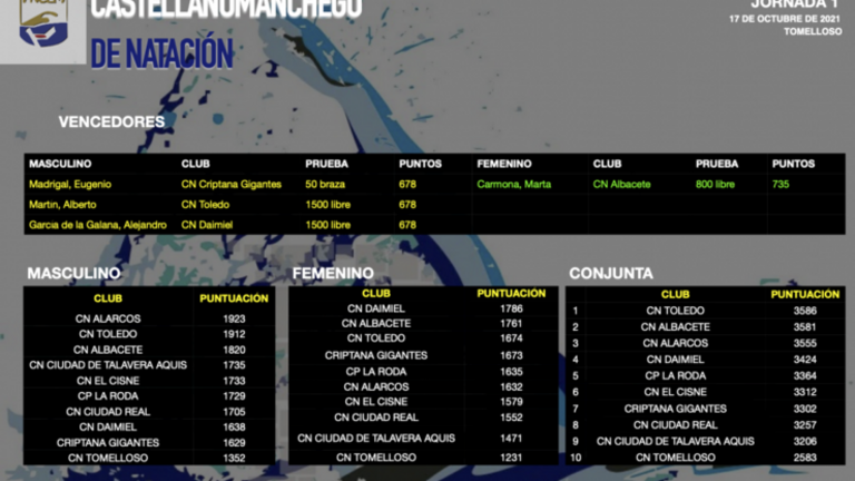 Sumando un total de 3302 puntos y la séptima posición en la piscina cubierta de Tomelloso Gran comienzo del CN Criptana Gigantes en el Circuito Castellano-Manchego de Natación F.J. PARRAS 19/oct/21 18:40 Gran comienzo del CN Criptana Gigantes en el Circuito Castellano-Manchego de Natación